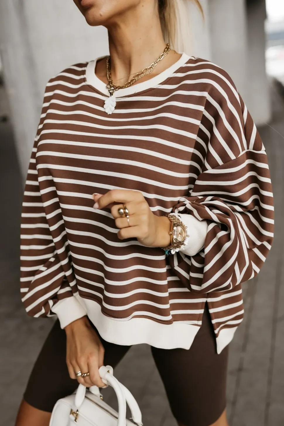 BLUZA BAWEŁNIANA MERRY OVERSIZE ASYMETRYCZNA Z ROZCIĘCIAMI PO BOKACH W PASKI BRĄZOWO-BEŻOWE