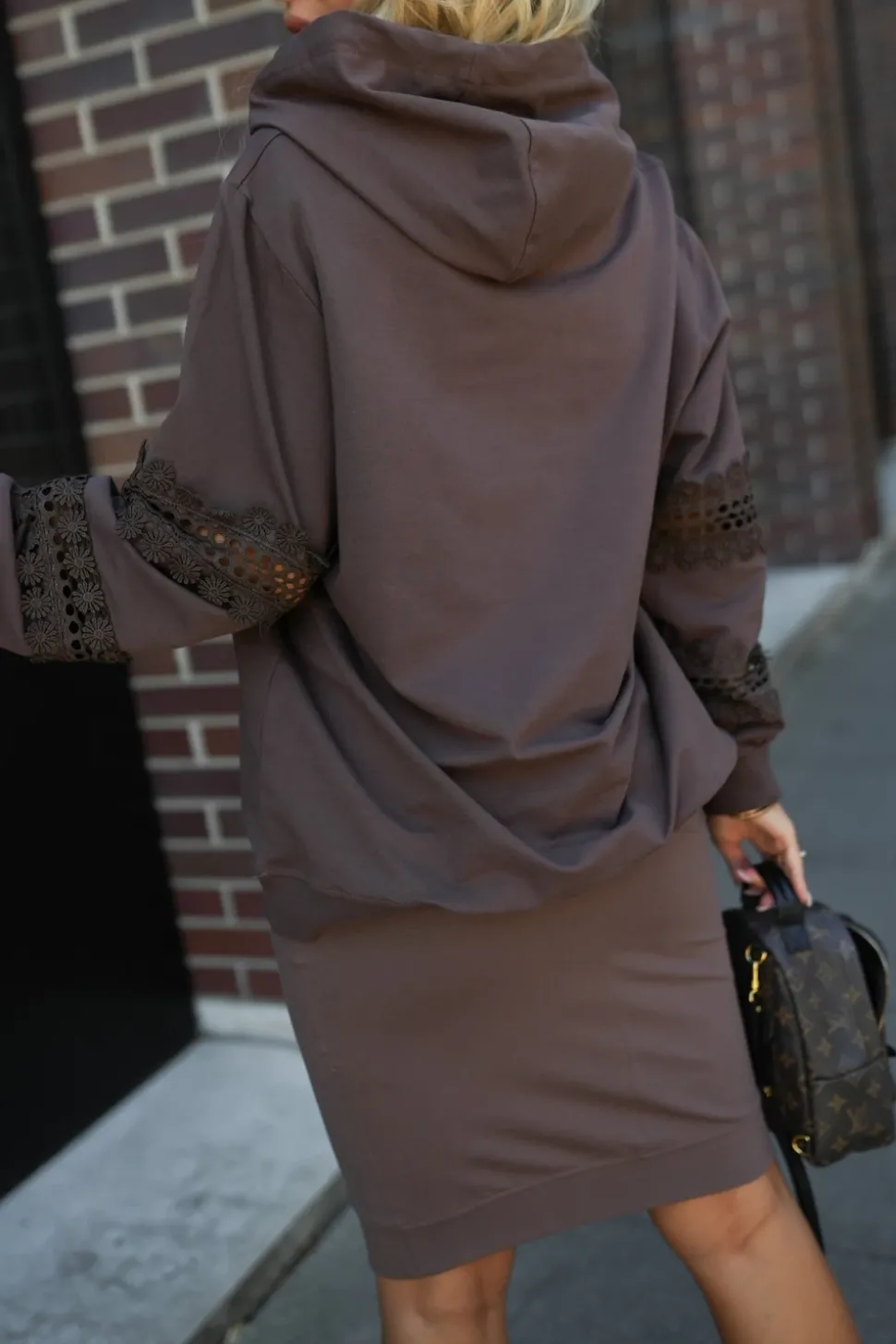 Bluza oversize o luźnym, wygodnym fasonie, idealna na co dzień. Wyposażona w praktyczny kaptur z troczkami, który nadaje sportowego charakteru i chroni w chłodniejsze dni. Długie rękawy ozdobione wstawkami z koronki dodają całości subtelnej, kobiecej nuty, tworząc ciekawy kontrast z casualowym stylem. Model zakończony jest ściągaczami na dole oraz przy rękawach, co zapewnia wygodę i dobre dopasowanie. To połączenie komfortu i delikatnej elegancji w jednym.