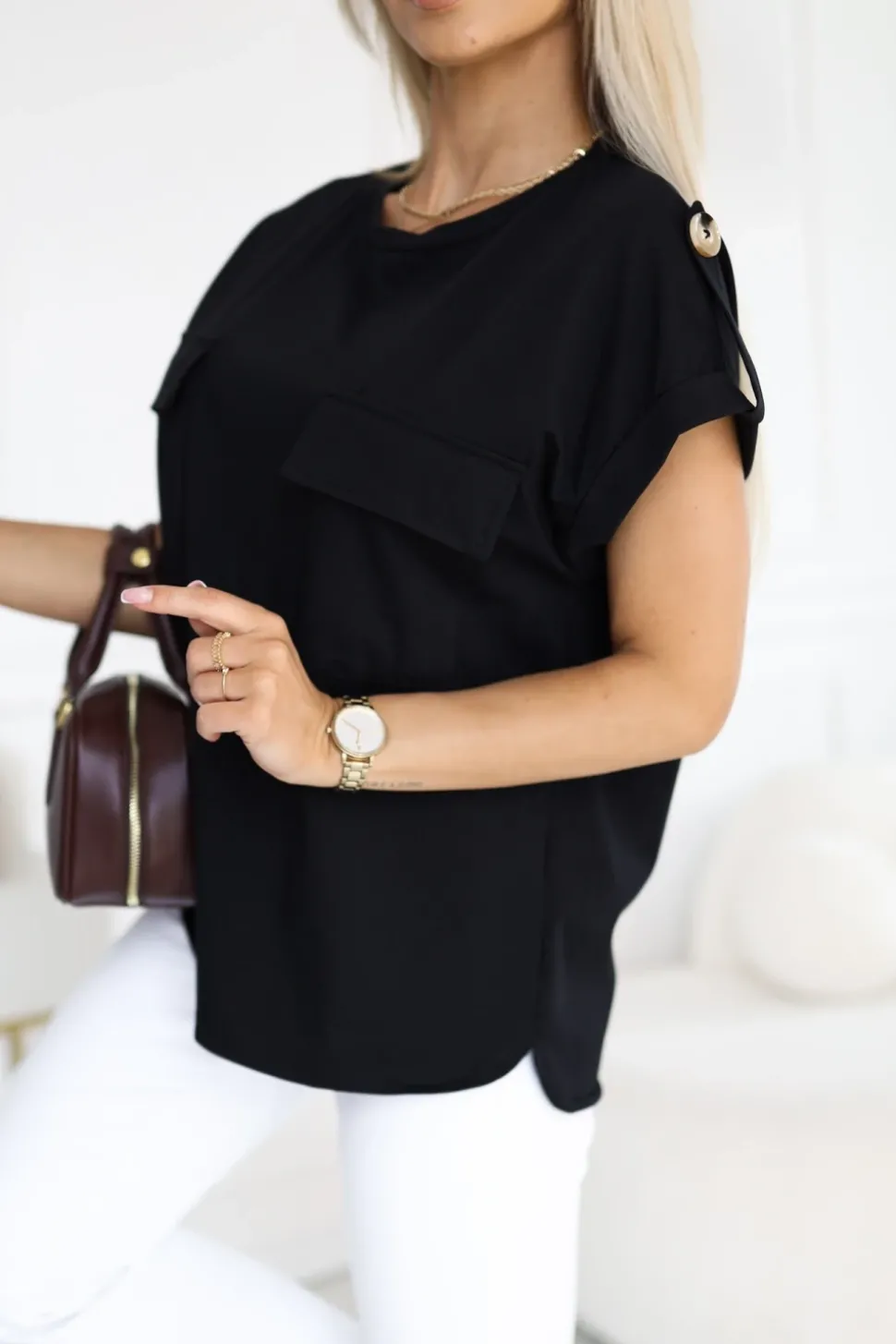 Asymetryczna bluzka o nowoczesnym kroju, która łączy elegancję z subtelnym, militarnym akcentem. Wykonana z lekkiego, przewiewnego materiału, zapewnia komfort noszenia przez cały dzień. Posiada okrągły dekolt oraz krótki rękaw z pagonami na ramionach, które nadają jej oryginalnego charakteru. Dwie kieszenie z patkami na przodzie dodają funkcjonalności i stylowego wykończenia. Bluzka doskonale sprawdzi się zarówno w codziennych, jak i bardziej eleganckich stylizacjach – świetnie wygląda w połączeniu ze spodniami w kant, jeansami czy spódnicą ołówkową.