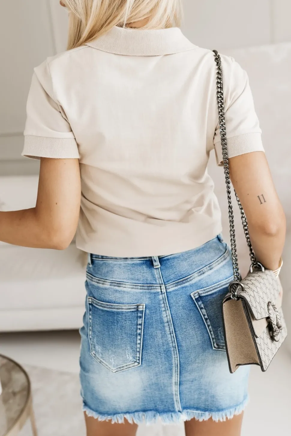 Bluzka z krótkim rękawem w stylu polo, łącząca klasyczny fason z nowoczesnymi detalami. Posiada elegancki kołnierzyk oraz zapięcie na trzy guziki, które nadaje jej sportowo-eleganckiego charakteru. Delikatnie asymetryczny krój oraz subtelne rozcięcia po bokach zapewniają swobodę ruchów i dodają lekkości. Na wysokości piersi umieszczono haftowany emblemat, który stanowi stylowy akcent. Idealna zarówno do casualowych, jak i bardziej eleganckich stylizacji.