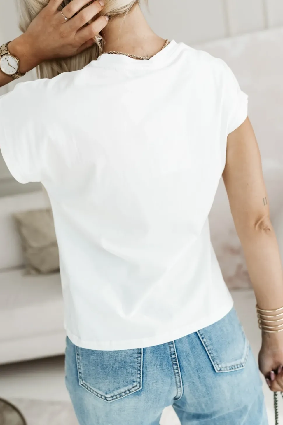 Bluzka z krótkim rękawem o klasycznym, prostym kroju. Okrągły dekolt nadaje jej uniwersalnego charakteru, a ażurowy motyw w górnej części dodaje elegancji i delikatności. Doskonale sprawdzi się zarówno w codziennych stylizacjach, jak i w bardziej eleganckich zestawieniach. Idealna do spódnic, jeansów czy eleganckich spodni.