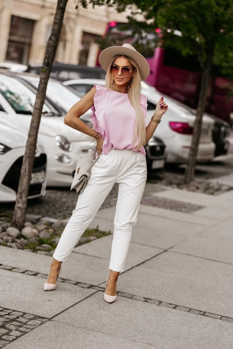 Klasyczna bluzka bez rękawów z okrągłym dekoltem. Całość zdobią oryginalne falbany. Bluzka idealnie sprawdzi się zarówno do pracy jak i na co dzień. Połącz ją z dopasowaną spódnicą lub spodniami.