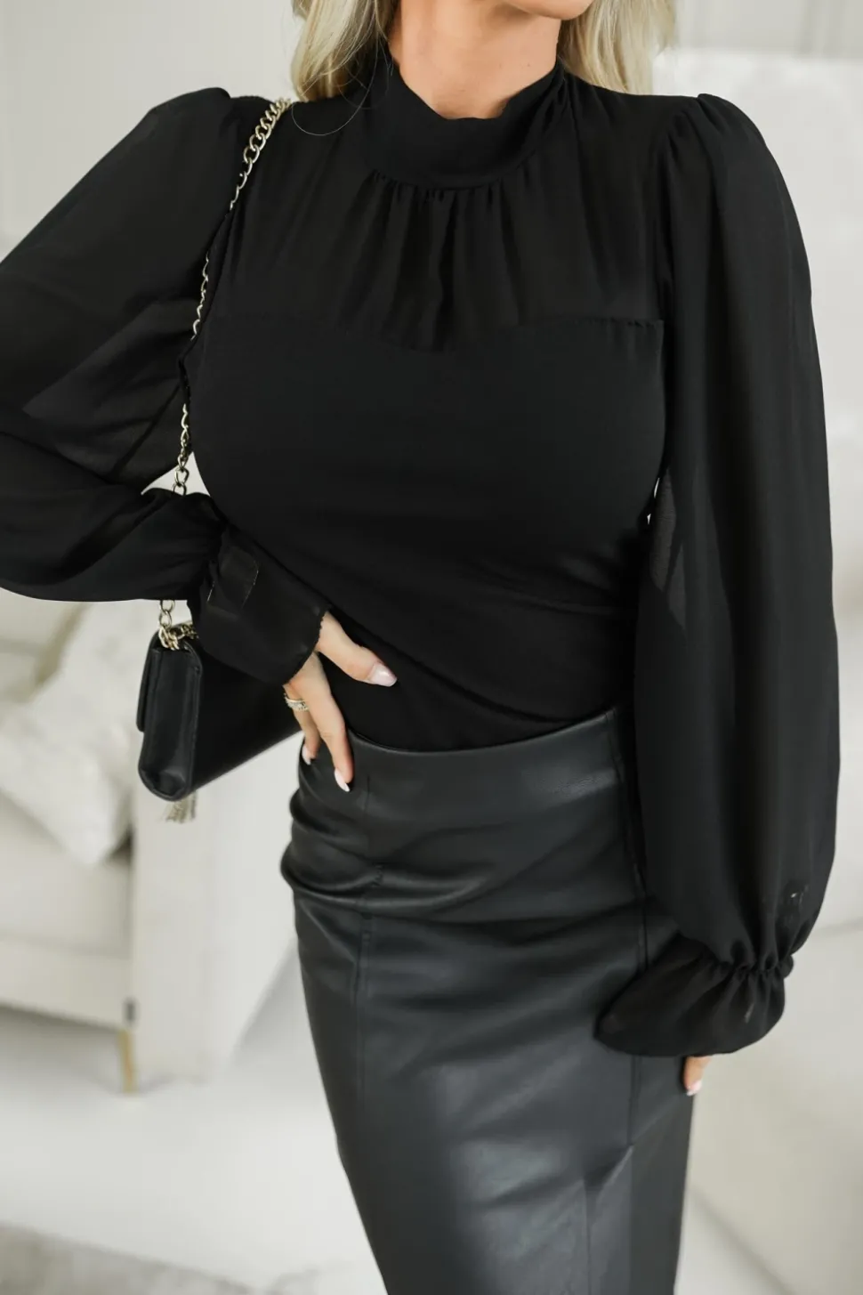 Elegancka bluzka, która zachwyca subtelnymi detalami. Góra została uszyta z delikatnie prześwitującego materiału, który dodaje lekkości i zmysłowości. Stójka wiązana z tyłu tworzy efektowny akcent. Długie rękawy z lekkimi bufkami zakończone są elastyczną gumką i falbanką, co nadaje bluzce romantyczny charakter. Idealna do eleganckich spodni, spódnic czy pod marynarkę – sprawdzi się zarówno na wyjątkowe okazje, jak i w stylizacjach do pracy.