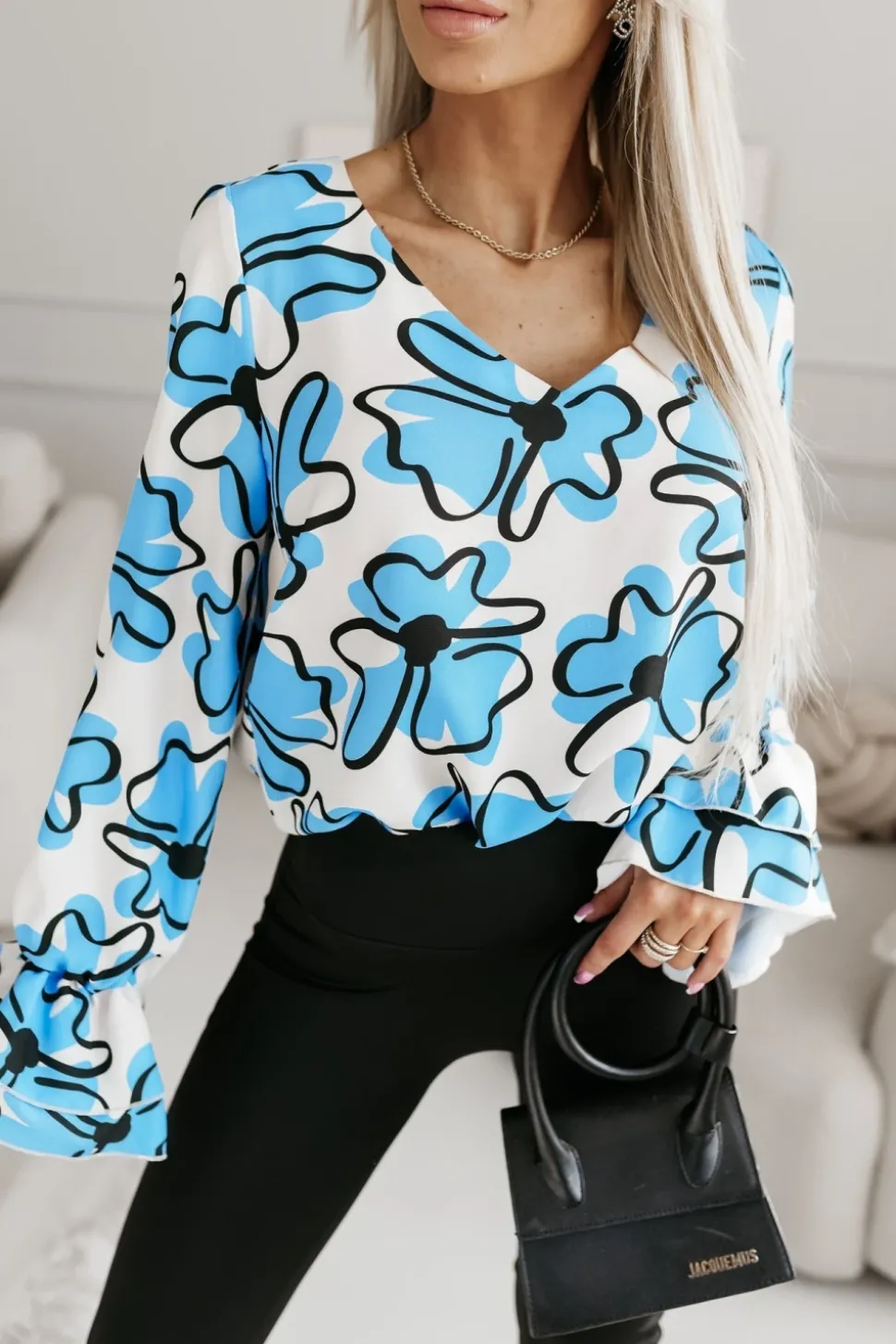 Elegancka bluzka koszulowa z dekoltem w serek. Oryginalności nadają jej długie rękawy zakończone piękną falbaną. Jej prosty fason będzie idealnym zestawieniem zarówno do eleganckiego dołu, jak i do bardziej casualowych stylizacji.
