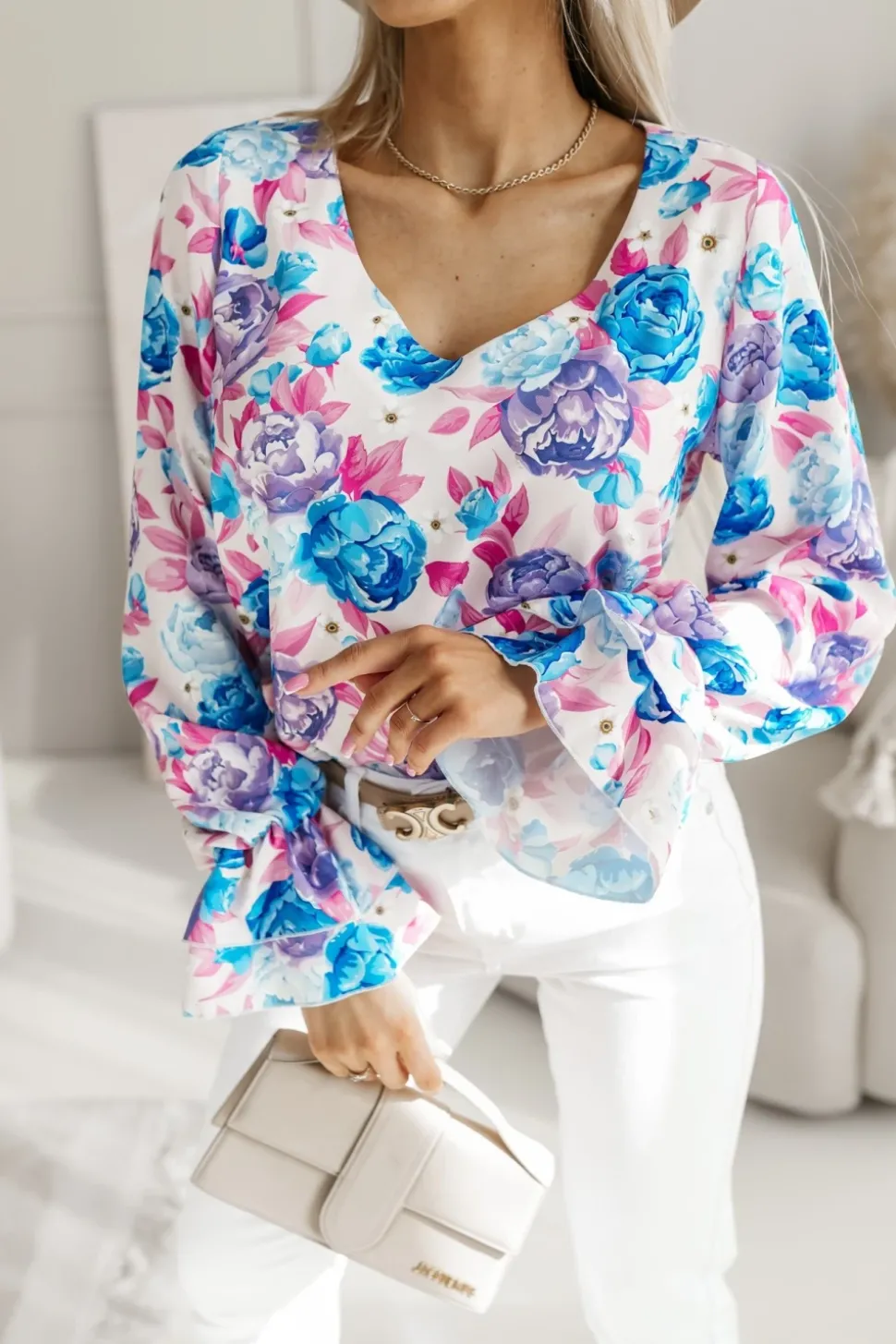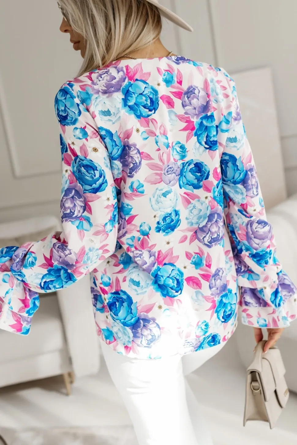Elegancka bluzka koszulowa z dekoltem w serek. Oryginalności nadają jej długie rękawy zakończone piękną falbaną. Jej prosty fason będzie idealnym zestawieniem zarówno do eleganckiego dołu, jak i do bardziej casualowych stylizacji.