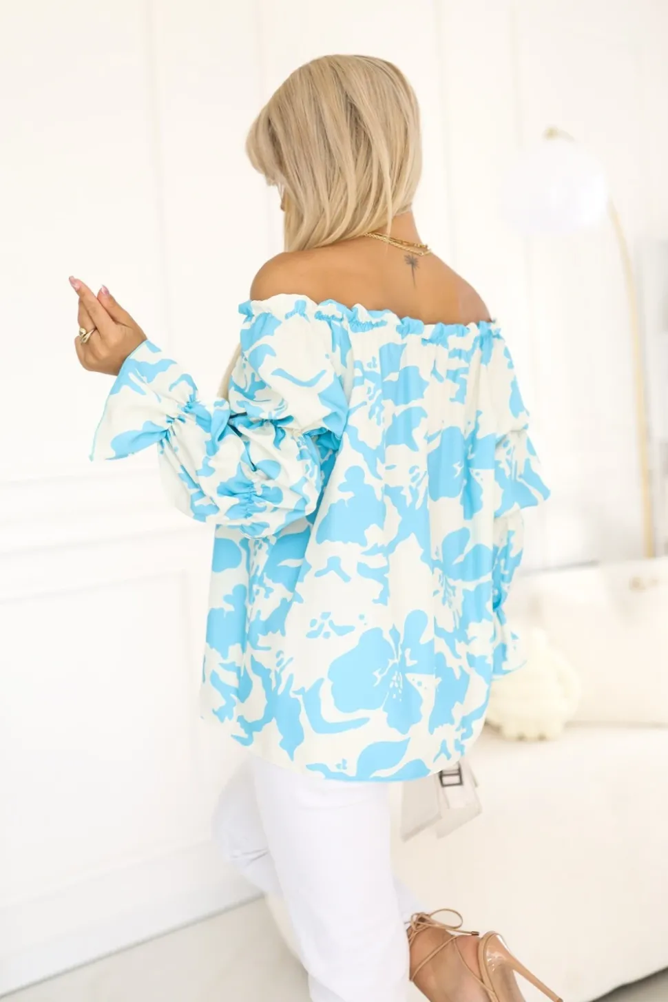 BLUZKA KOSZULOWA INEZ HISZPANKA BEŻOWO-NIEBIESKA W KWIATY