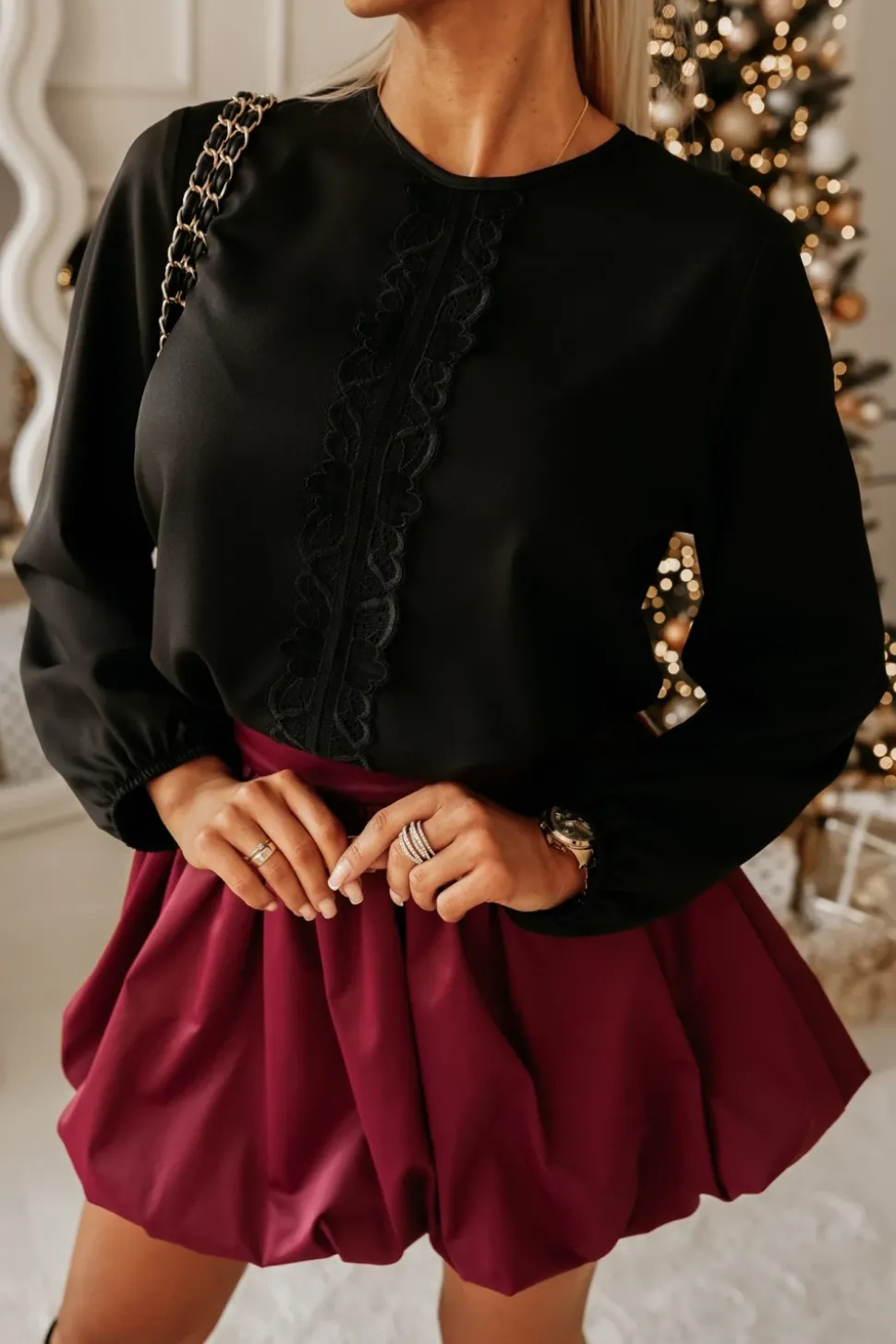 Bluzka koszulowa o eleganckim kroju, z długim rękawem zakończonym gumką, która nadaje jej subtelnej struktury. Wzdłuż bluzki znajduje się delikatny koronkowy pas, który dodaje romantycznego charakteru. Okrągły dekolt uzupełnia całość, a guzik z tyłu zapewnia wygodne zapinanie. Dodatkowo, bluzka posiada rozcięcia po bokach, które nadają jej lekkości i sprawiają, że jest bardziej przewiewna. Idealna do stylizacji na co dzień, jak i na specjalne okazje.