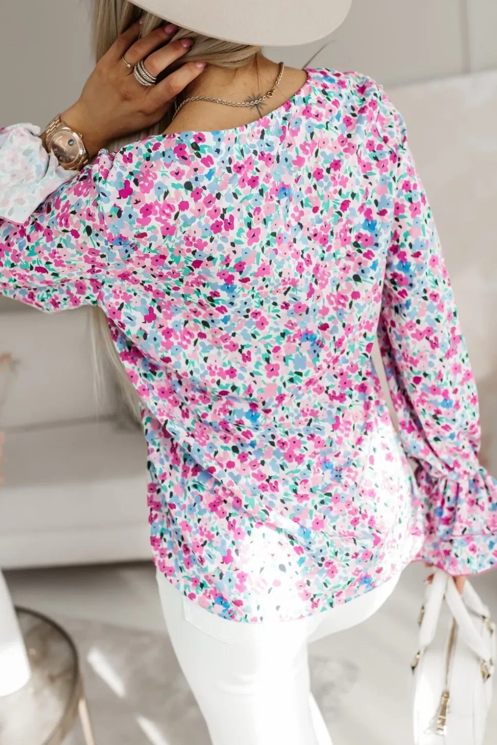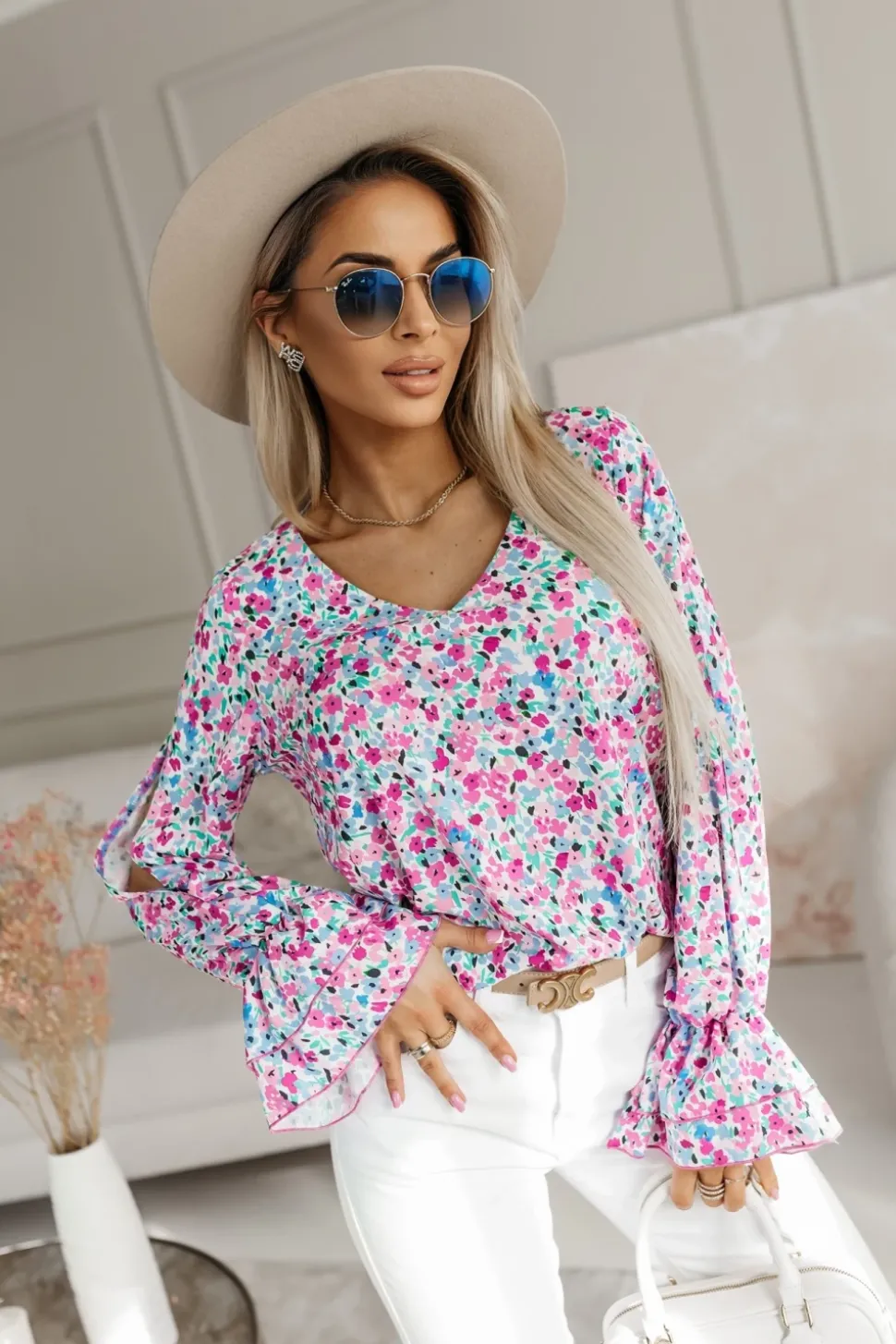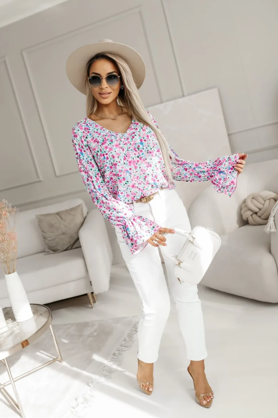 Piękna bluzka koszulowa o oryginalnym wzorze to idealna propozycja zarówno do pracy, jak i do codziennych stylizacji. Jej długie rękawy zostały wykończone dwiema falbanami, a także rozcięciem na łokieć, które dodaje całości niesamowitego efektu. Wykonana z mało elastycznego materiału. Posiada dekolt w serek. Ten prosty fason idealnie komponuje się z eleganckimi spodniami lub casualowymi jeansami.