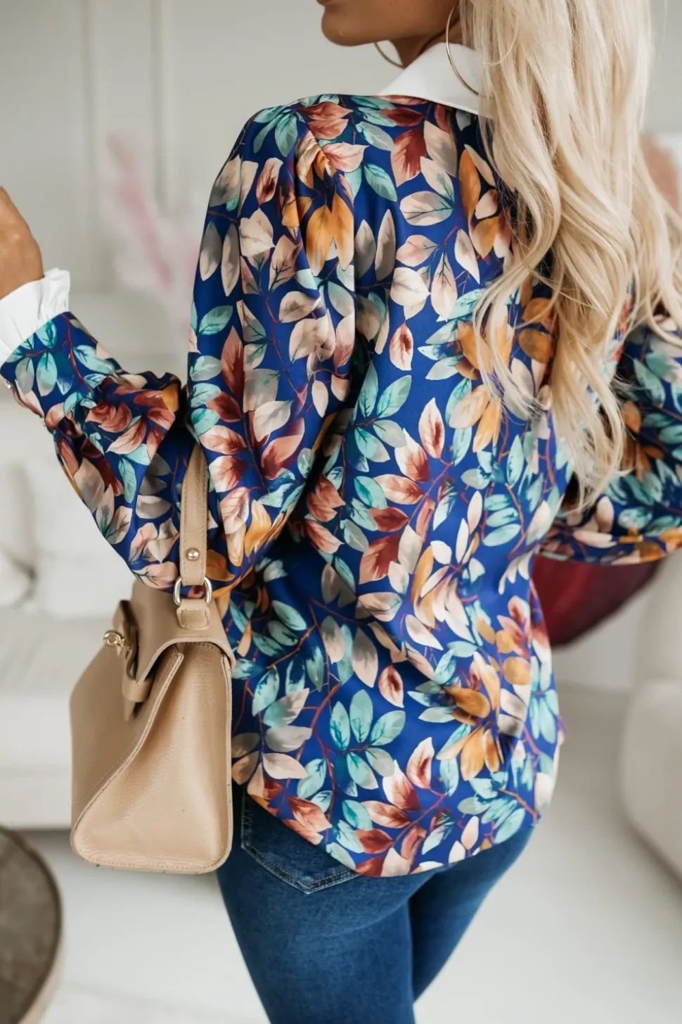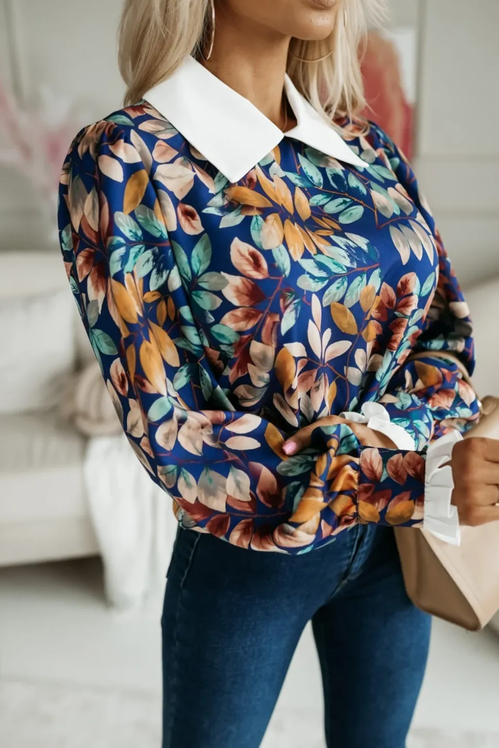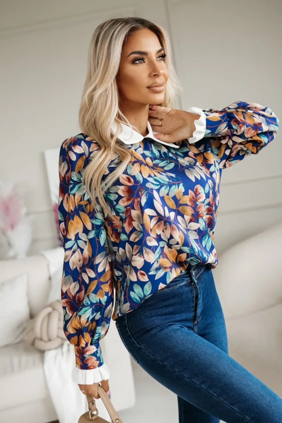 Elegancka bluzka koszulowa o prostym, lekko asymetrycznym kroju, która łączy klasyczny design z subtelnymi, kobiecymi detalami. Posiada kołnierzyk, który nadaje jej formalnego charakteru. Zapinana na karku na dwa guziki, co dodaje jej wyjątkowego akcentu i ułatwia zakładanie. Długie rękawy zakończone są rozpinanymi mankietami i ozdobione delikatną falbanką, wprowadzającą romantyczny element. Wykonana z mało elastycznego materiału, bluzka utrzymuje swój kształt i zapewnia schludny wygląd przez cały dzień. Doskonale komponuje się z eleganckimi spodniami, spódnicami czy nawet jeansami, tworząc stylowe i wyrafinowane zestawienia.