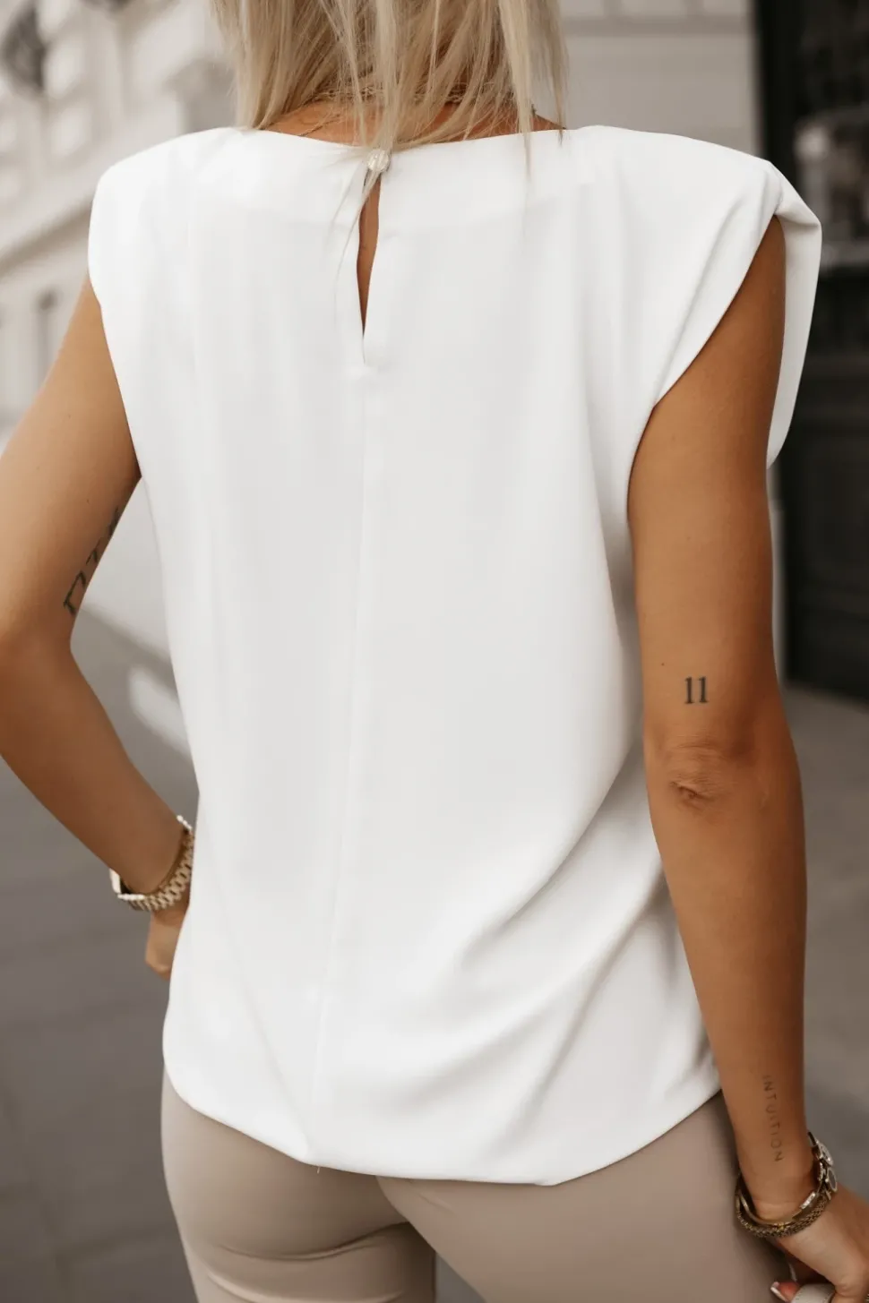 Bluzka bez rękawów o prostym, minimalistycznym kroju, z okrągłym dekoltem i zapięciem na guzik z tyłu, które ułatwia zakładanie. Wyróżnia się poduszkami na ramionach, które dodają sylwetce wyrazistości i lekko strukturalnego charakteru. Uniwersalna i stylowa – doskonale sprawdzi się zarówno w eleganckich, jak i casualowych stylizacjach.