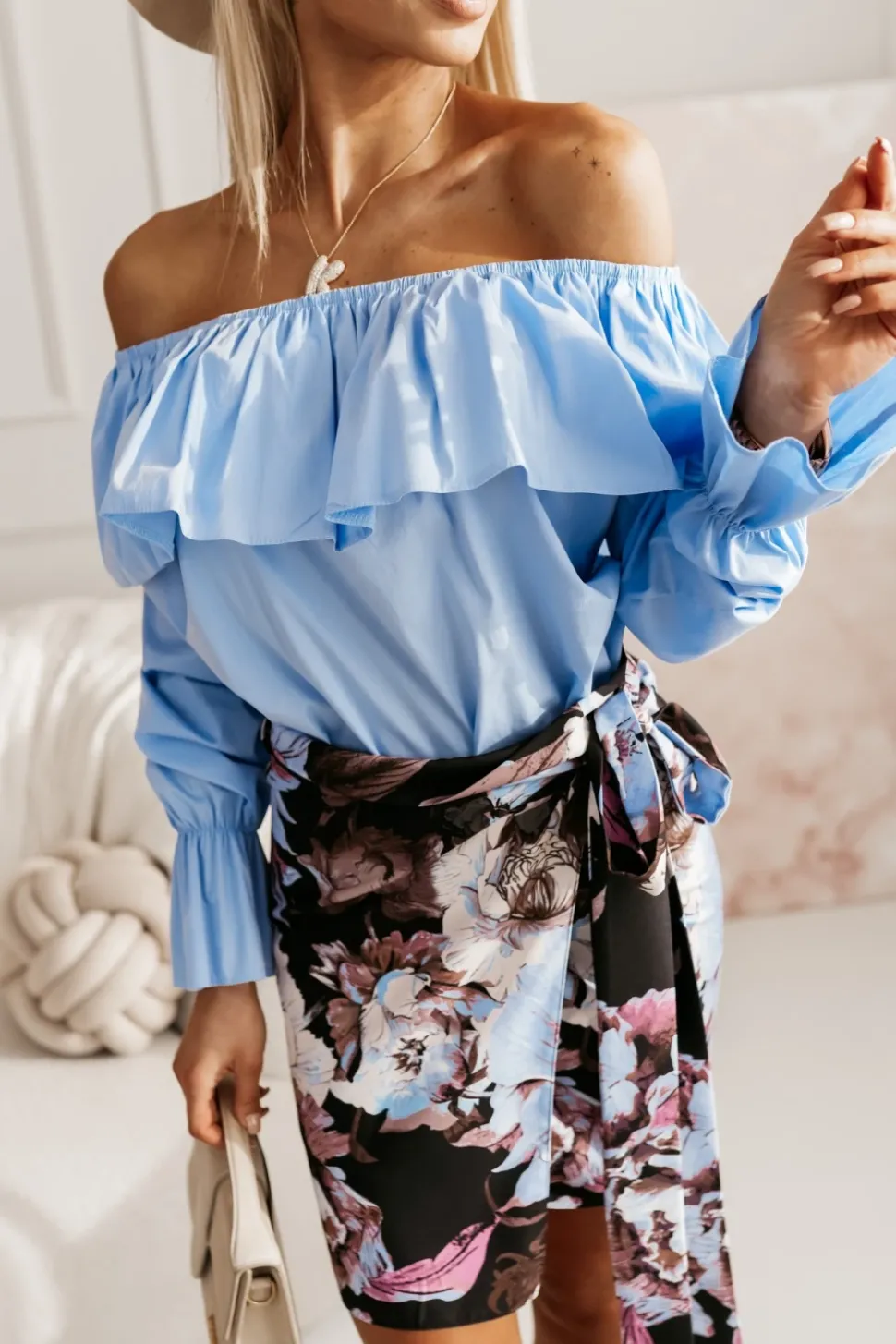 Bluzka hiszpanka o prostym kroju, z urokliwą falbanką na górze i na zakończeniach długich rękawów, co dodaje jej lekkości i kobiecego uroku. Dzięki prostemu fasonowi doskonale łączy się z różnymi dołami, zarówno z jeansami, jak i spódnicami, tworząc elegancką, ale jednocześnie wygodną stylizację na co dzień. Idealna na wiosenne i letnie dni, kiedy chcesz poczuć się lekko i swobodnie, ale wciąż modnie.