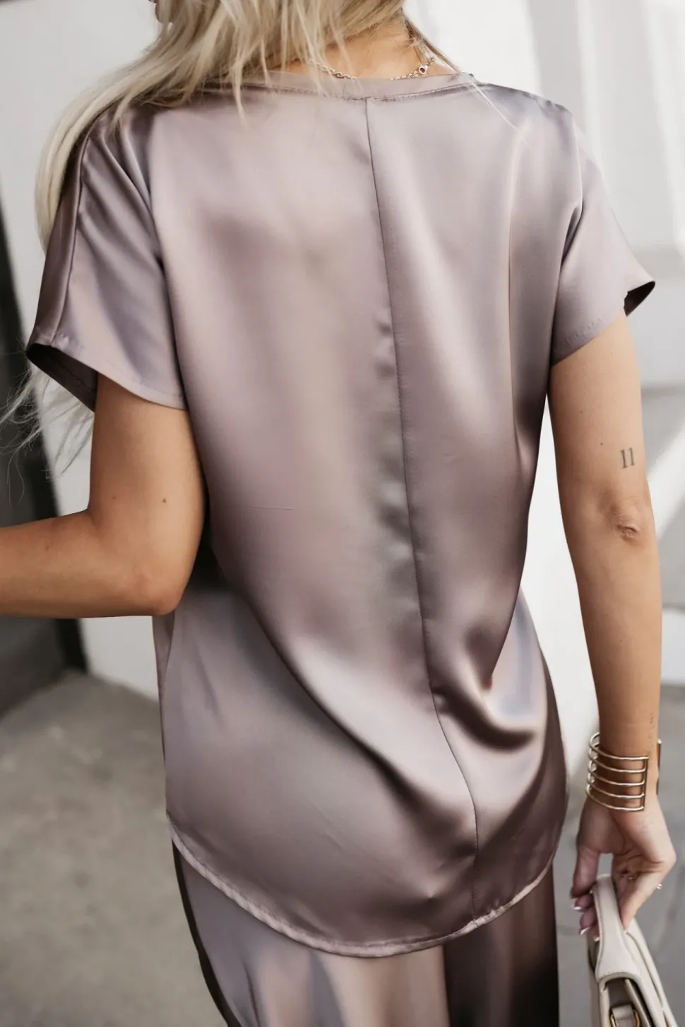 To elegancka satynowa bluzka, która wyróżnia się subtelnym połyskiem materiału, dodającym jej luksusowego charakteru. Ma dekolt w serek, który ładnie podkreśla linię szyi i dekoltu. Krótki rękaw sprawia, że jest idealna na cieplejsze dni lub do noszenia pod żakietem. Na plecach znajduje się delikatne przeszycie, które dodaje akcentu i lekkiej struktury. To wszechstronny element garderoby, który można stylizować zarówno na eleganckie, jak i bardziej casualowe okazje.