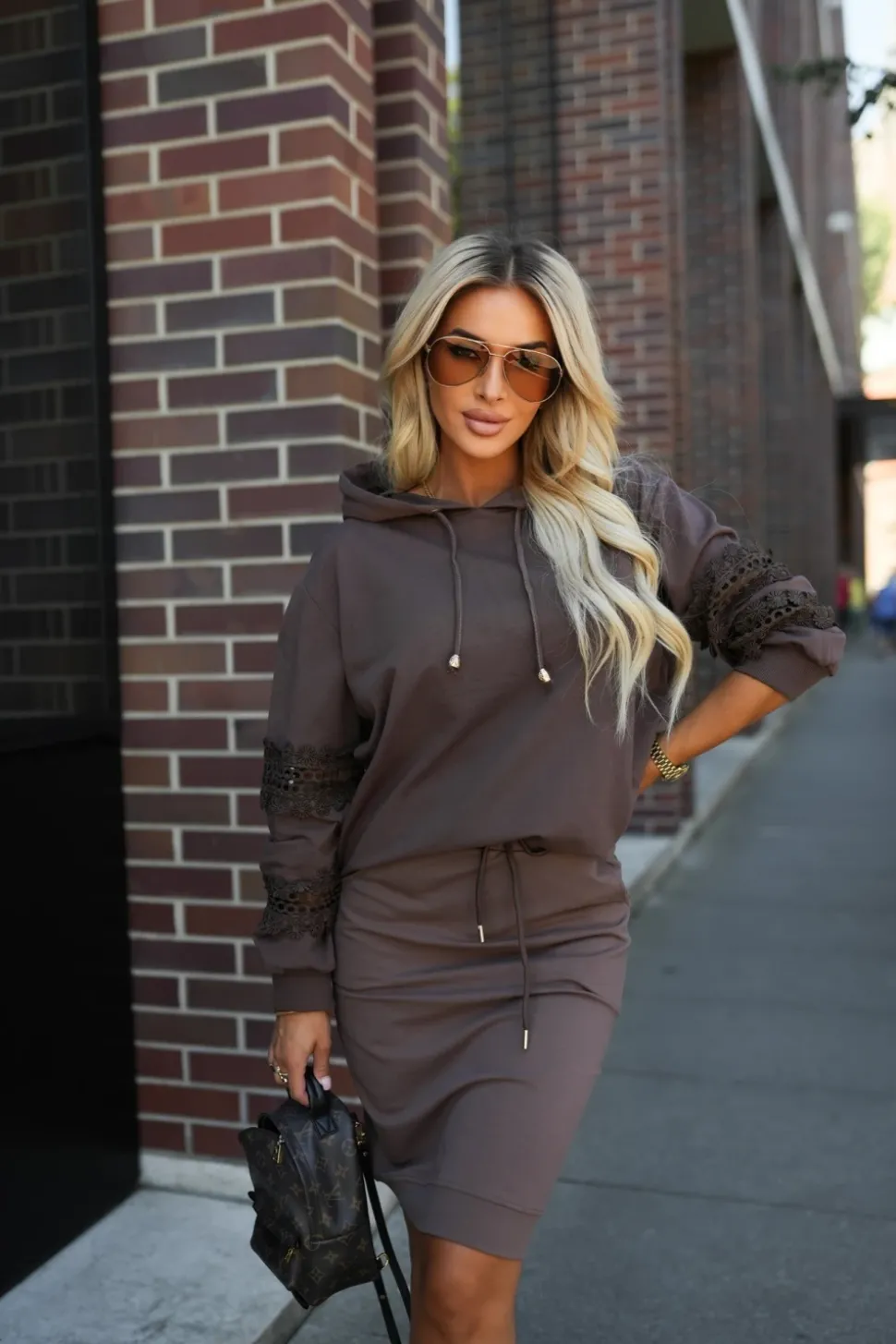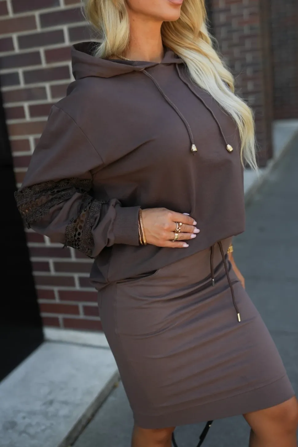 Bluza oversize o luźnym, wygodnym fasonie, idealna na co dzień. Wyposażona w praktyczny kaptur z troczkami, który nadaje sportowego charakteru i chroni w chłodniejsze dni. Długie rękawy ozdobione wstawkami z koronki dodają całości subtelnej, kobiecej nuty, tworząc ciekawy kontrast z casualowym stylem. Model zakończony jest ściągaczami na dole oraz przy rękawach, co zapewnia wygodę i dobre dopasowanie. To połączenie komfortu i delikatnej elegancji w jednym.