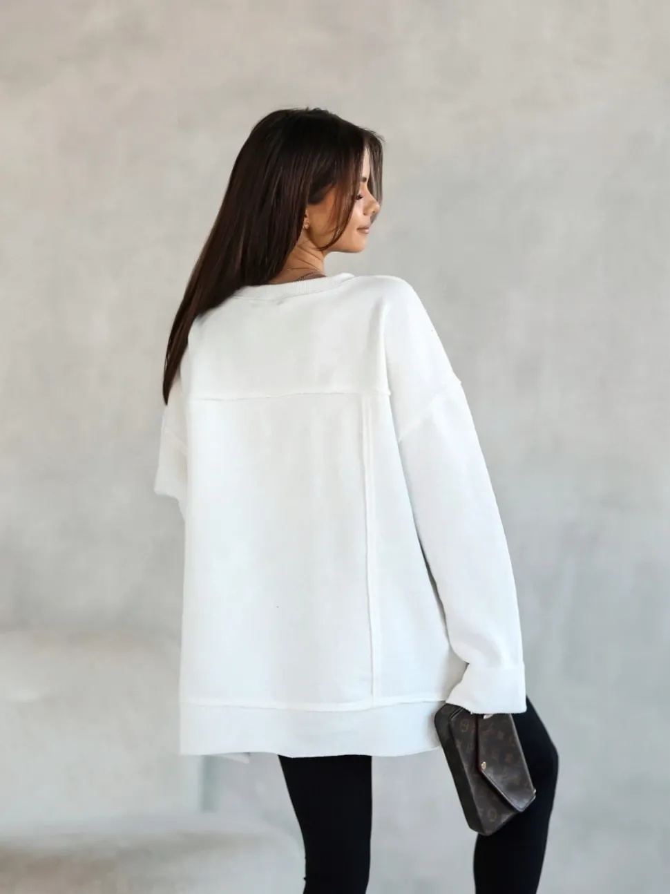 Bluza oversize to nowoczesna propozycja o wyrazistym charakterze. Wykonana w swobodnym, asymetrycznym kroju z okrągłym dekoltem i długim rękawem, zapewnia wygodę i modny wygląd. Ozdobiona efektownymi zewnętrznymi szwami oraz stylizowanymi rozpruciami, wpisuje się w aktualne trendy streetwearowe. Idealna do codziennych stylizacji z jeansami, legginsami czy spódnicą dla odważnego, miejskiego looku.