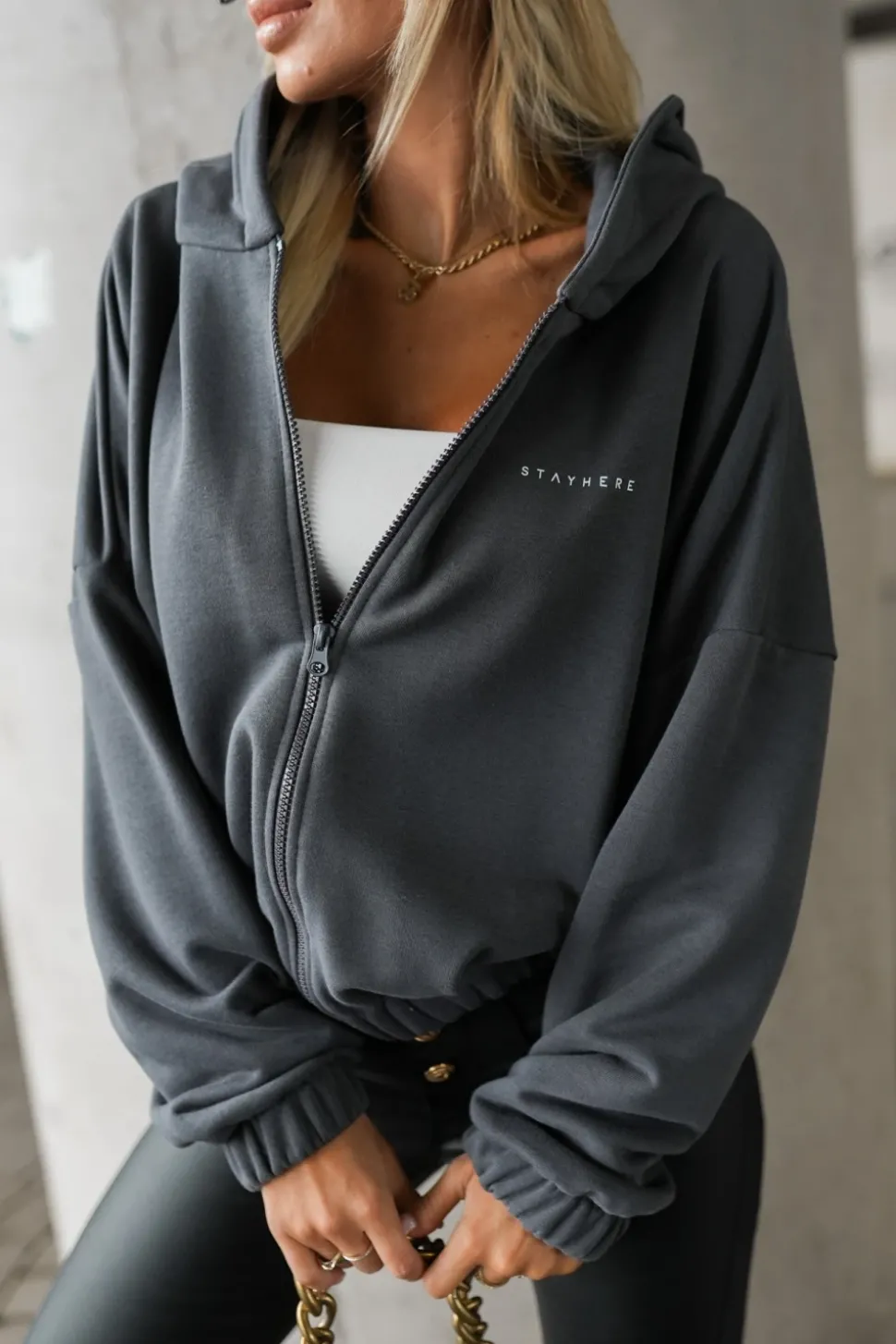 Bluza z kapturem, zapinana na zamek, to wygodna i stylowa propozycja na co dzień. Wyposażona w praktyczny kaptur i zakończona ściągaczem przy rękawach oraz u dołu, zapewnia komfort i dobre dopasowanie. Na boku znajduje się nadruk z napisem „stayhere”, który dodaje całości nowoczesnego, streetwearowego charakteru. Idealna do casualowych stylizacji i aktywności na świeżym powietrzu.