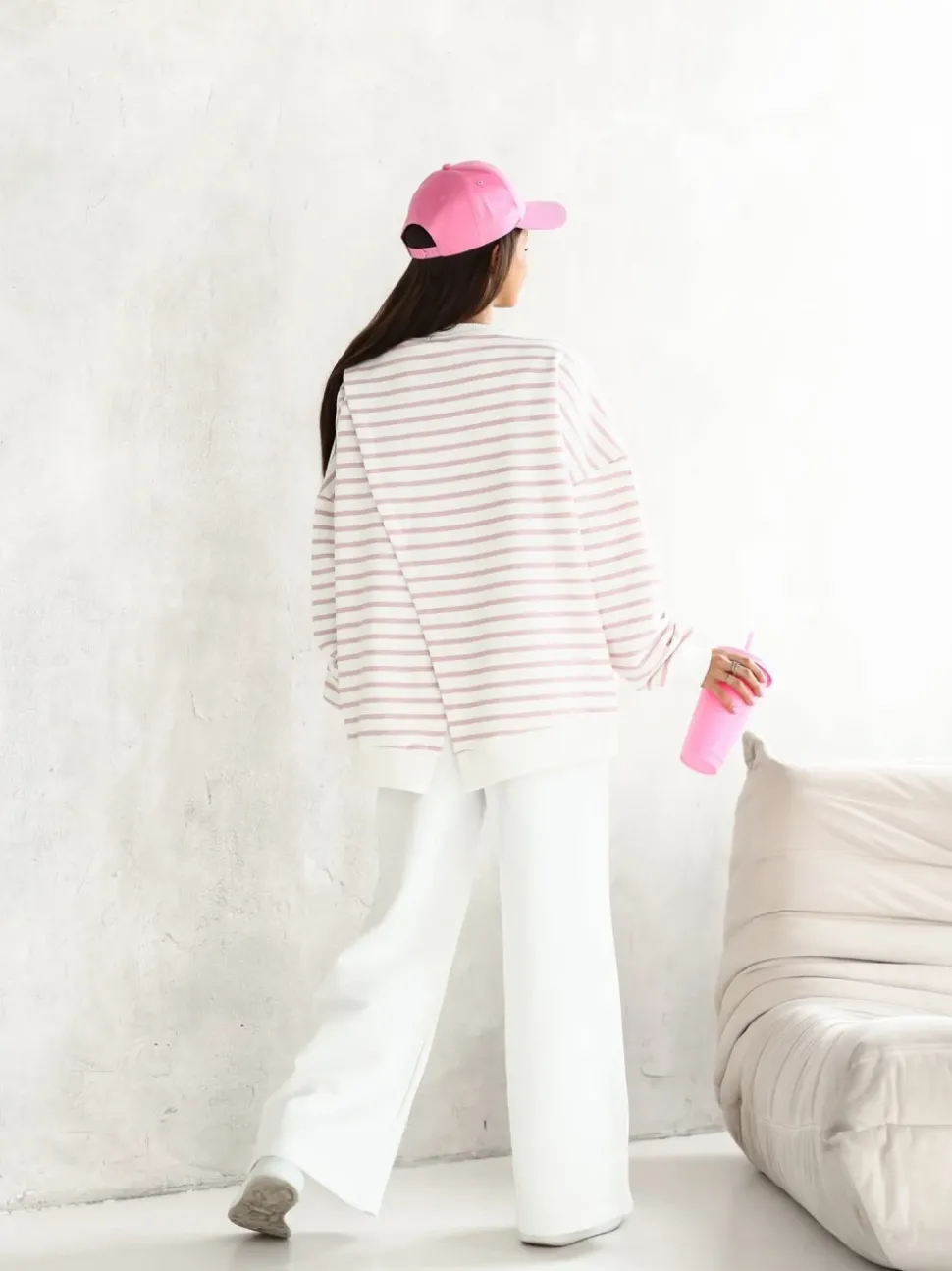 BLUZA DRESOWA BAWEŁNIANA Z ROZCIĘCIEM NA PLECACH W PASKI ECRU-RÓŻOWE