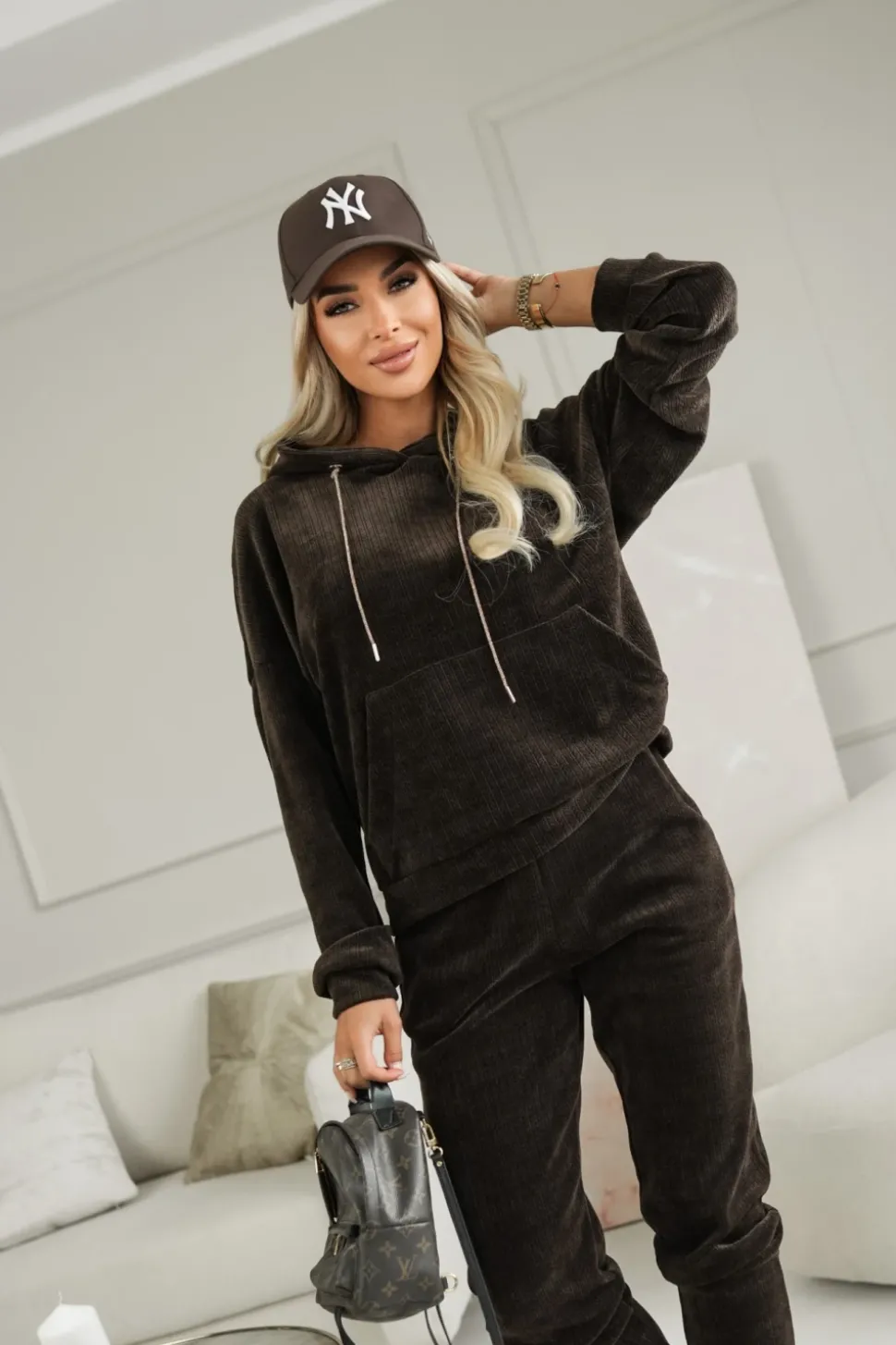 Bluza wyróżniająca się tłoczonym wzorem na materiale. Kaptur posiada ozdobne troczki oraz praktyczną kieszeń typu kangurka, co nadaje jej sportowego charakteru. Świetnie sprawdzi się zarówno na co dzień, jak i w luźniejszych, miejskich stylizacjach.