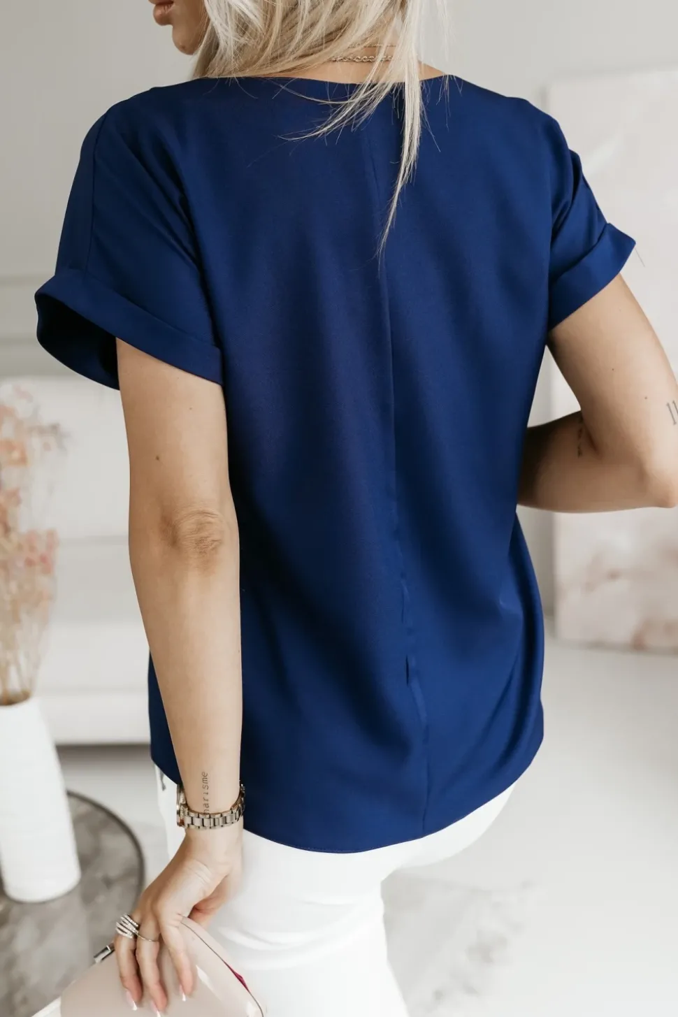 Elegancka bluzka o prostym kroju. Posiada dekolt w serek oraz krótki rękaw zakończony podwinięciem. Wykonana jest z dobrej jakości, mało elastycznego materiału. Pasuje zarówno do stylizacji formalnych jak i casualowych.