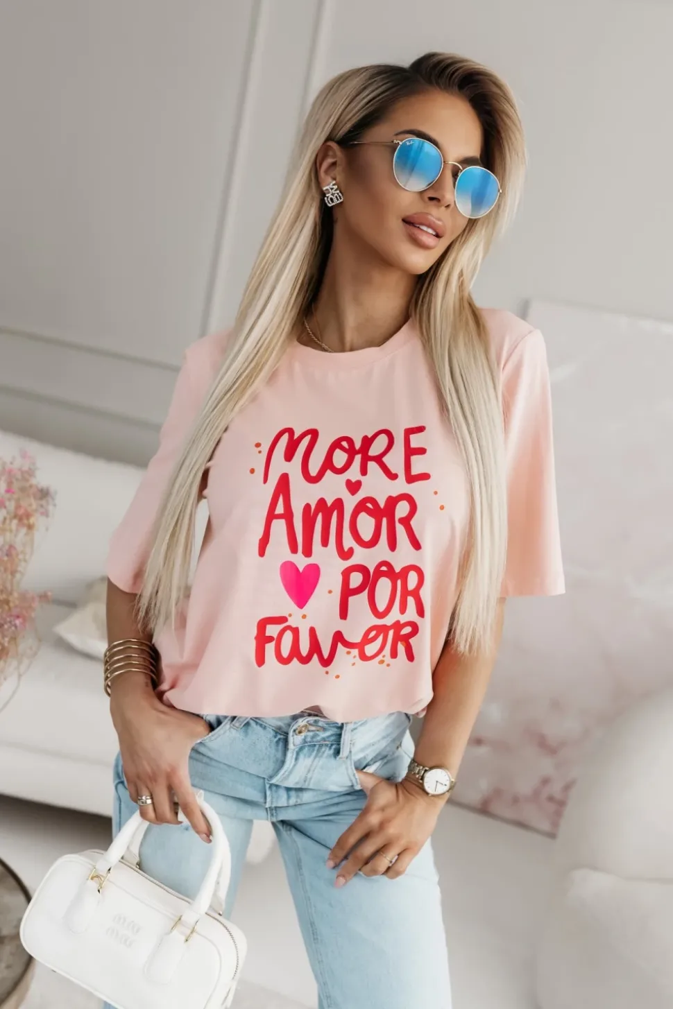 Prosty t-shirt z krótkim rękawem, wykonany z miękkiego, bawełnianego materiału. Okrągły dekolt i klasyczny, prosty krój sprawiają, że jest to must-have w każdej garderobie. Na przodzie widnieje napis „MORE AMOR POR FAVOR„, który dodaje koszulce oryginalnego charakteru. Idealny do codziennych stylizacji, łącząc komfort z unikalnym stylem.