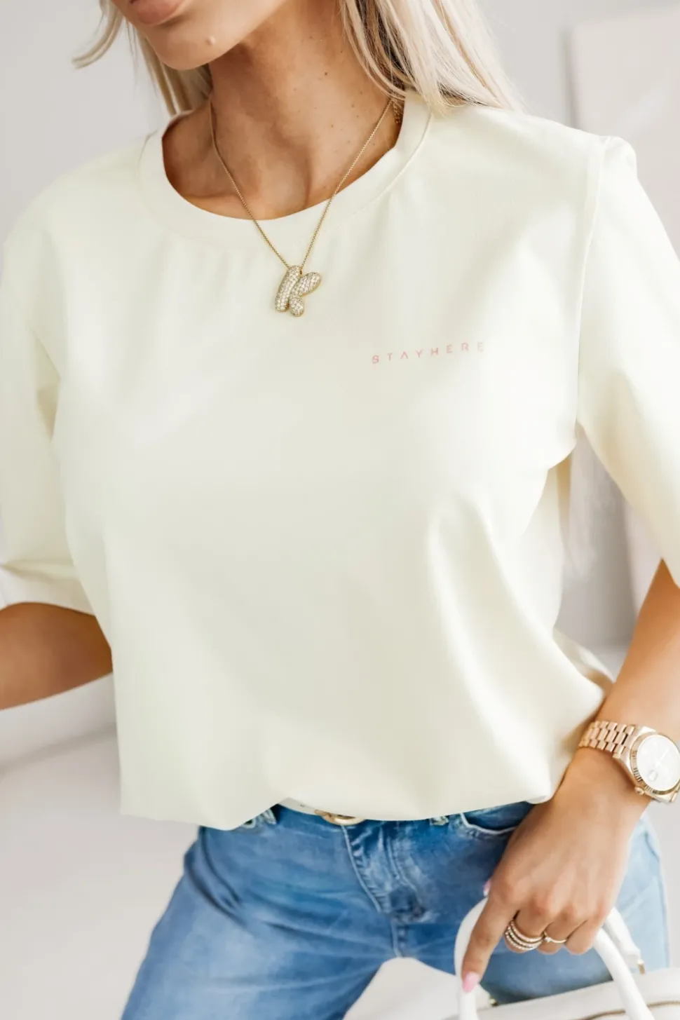 T-SHIRT BAWEŁNIANY Z NAPISEM STAYHERE BEŻOWY