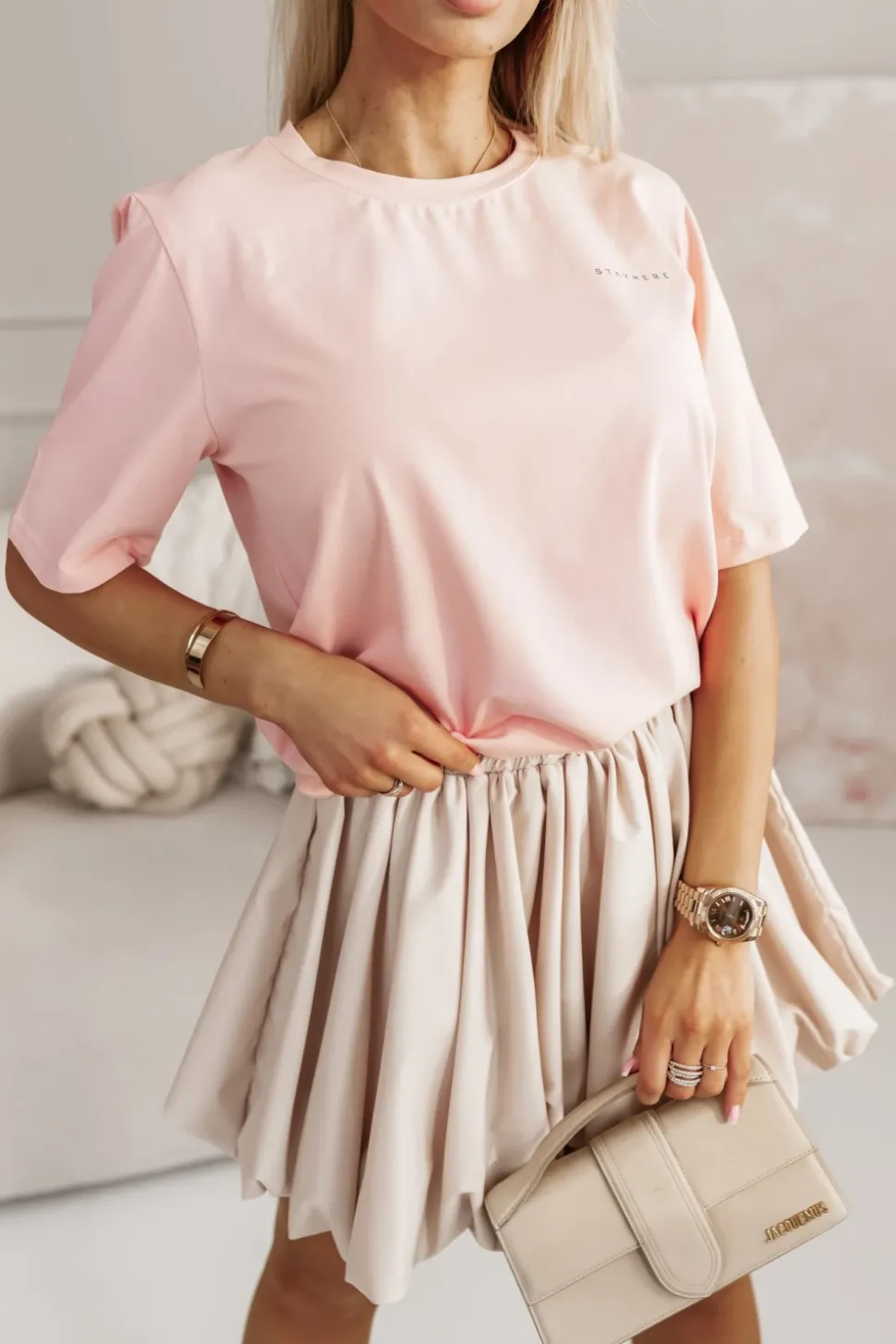 T-shirt z okrągłym dekoltem i krótkim rękawem to idealny wybór na codzienne stylizacje. Jego prosty krój zapewnia wygodę, a nadruk „STAY HERE” na piersi dodaje charakteru i nowoczesnego akcentu. Uniwersalny, pasuje do wielu różnych outfitów – od casualowych po bardziej miejskie zestawy. Świetnie komponuje się z dżinsami, szortami czy joggerami, tworząc wygodny, ale stylowy look.