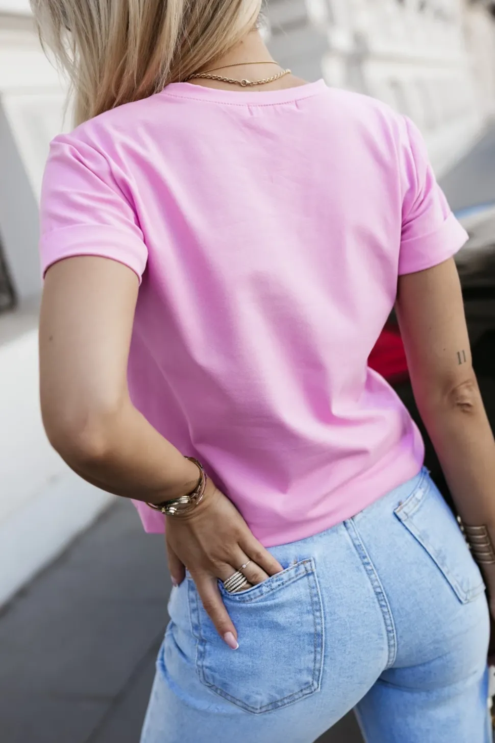 Casualowy T-shirt o klasycznym kroju, który łączy wygodę z modnym akcentem Posiada okrągły dekolt oraz krótkie, podwinięte rękawy, nadające mu swobodnego, stylowego wyglądu. Na środku znajduje się efektowny nadruk przedstawiający kobietę w okularach, który dodaje charakteru i wyróżnia koszulkę na tle klasycznych modeli. Idealnie sprawdzi się w codziennych stylizacjach – świetnie wygląda zarówno z jeansami, jak i eleganckimi spodniami czy spódnicą.