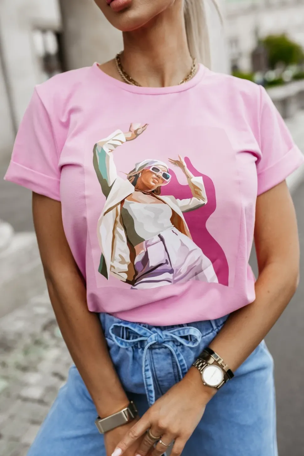 T-SHIRT Z NADRUKIEM KOBIETA W OKULARACH RÓŻOWY
